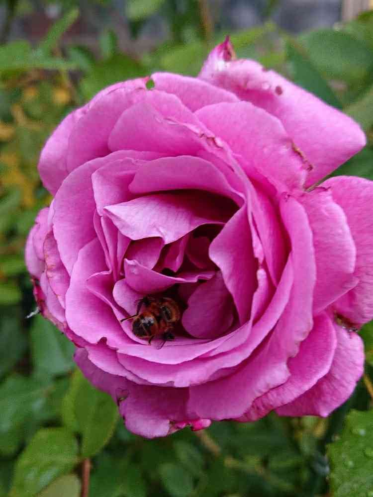 風でボロボロになってしまったショッキングブルー🌹に蜜蜂🐝 触れてもモソモソとしか動かない💦 香りに導かれここまで来て力尽きるのか? 落ちないように奥まで入れて……お疲れ様😌香りに包まれてゆっくりお休み(´ω` )zzZ