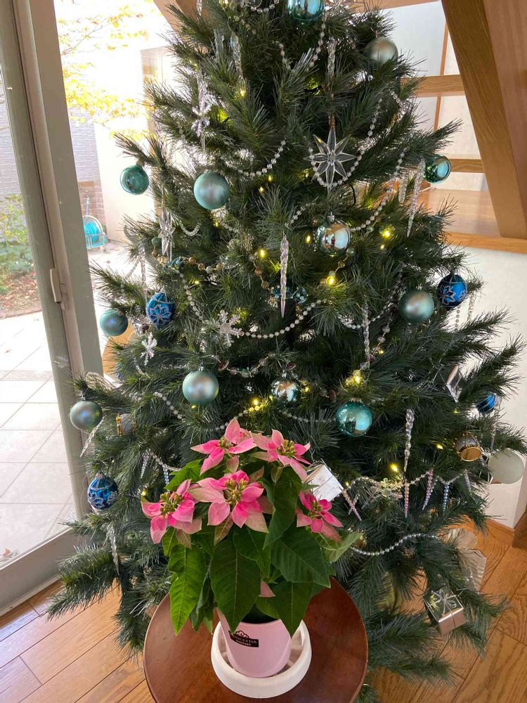 自宅に飾ったツリーと昨日買ってきてもらったプリンセチアと記念撮影♬ 笑
