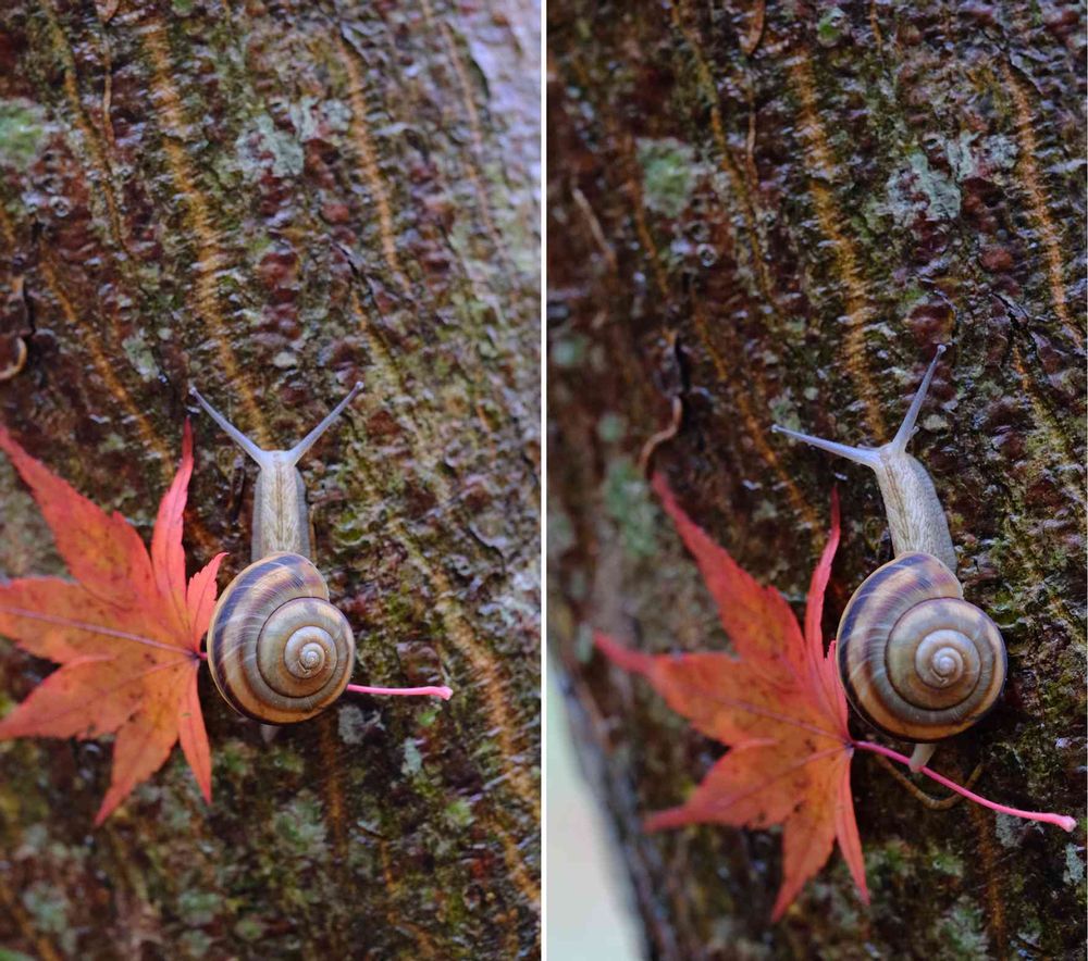 これもたまたまその木のすぐ下を撮ったから気づいたのですが、そうでなければ通り過ぎていたでしょうし、カタツムリもあの位置にはいなかったはずです。