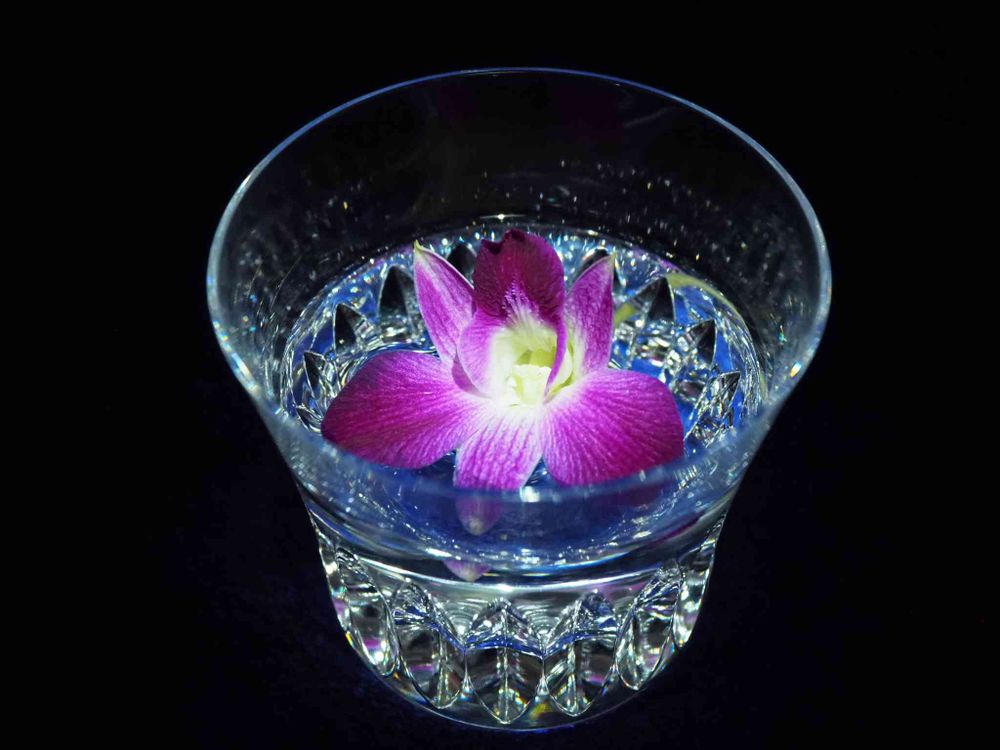 枝から花ごと落ちたのでまだ捨てるにはしのびなくて、グラスに水を入れ、花を浮かべて楽しみました。
