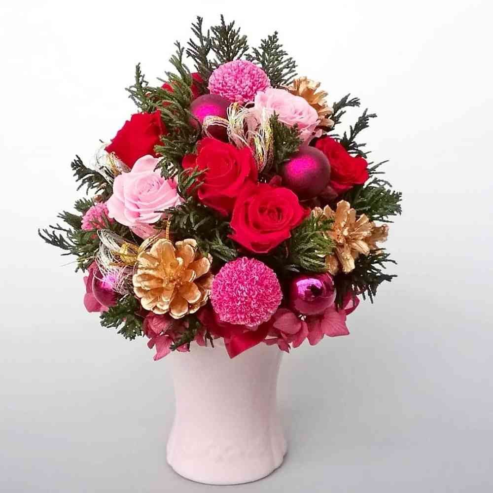 ピンクの薔薇と、ゴールドのオーナメントの輝くアレンジです✨🎄✨