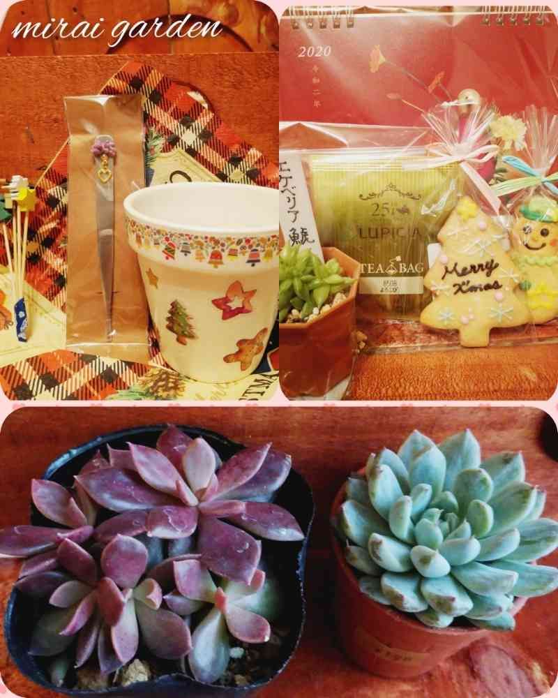 ↗のりよさんからエケさんの鯱✨持ってない子だから嬉しい♡(ღ˘⌣˘ღ)大切に育てます😆多肉ちゃんの記録にカレンダーとクリスマスクッキー😋それとルピシアのティーバッグも🎵孫に食べられる前に食べます🤣