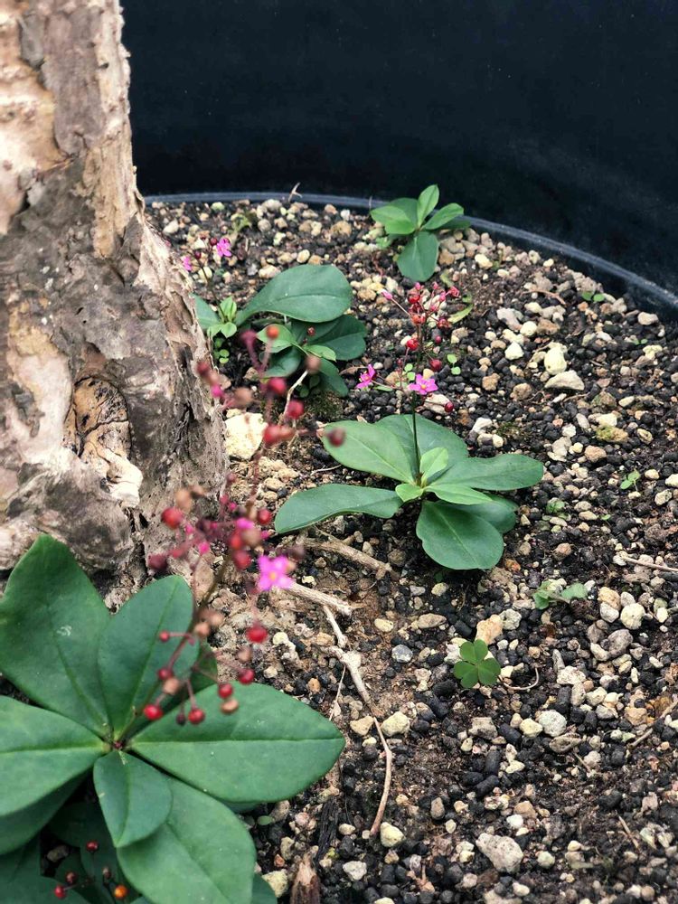 ブーゲンビリアの鉢に生えるピンクの花の謎の雑草。