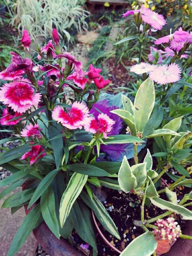 撫子が元気よく咲いてきてふいりの葉が出て来ました😄 ちなみに隣はふいりのスキミアです。