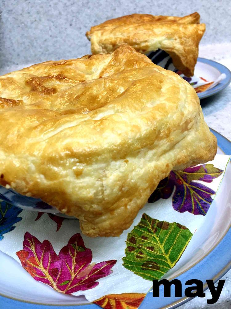 スープはカレー味に変更して急きょ冷凍庫にあったパイシートをかぶせてパイシチューに。