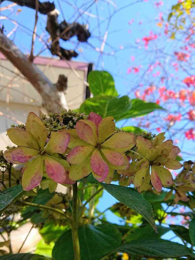 青空の中の綺麗なもみじの下で、ほっぺを赤くして対抗してるかのようなガクアジサイちゃんがとても愛しかったです。