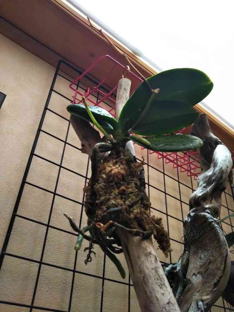 今年から始めた流木胡蝶蘭❗️二投稿目になります。左側から上に延びてきました。怪しいかな「花芽」と思いし物が・・・(格安品葉だけの物購入)?右の葉の間からは「根」ですよ 多分❗️屋根からの明かりが入りますが、雪が積もると真っ暗になります。胡蝶蘭はあまり光がいらないと聞きましたが⁉️ 室内の明かりで成長するか楽しみです。