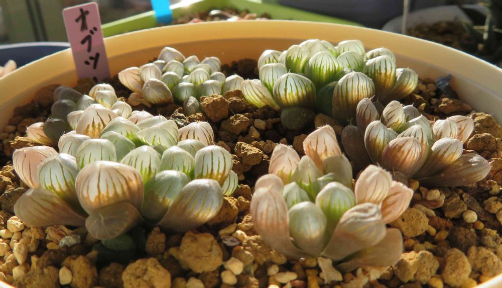 群生オブツーサから株分けした子株たち。夕日を浴びて窓が一斉に輝く様子が美しい。元の群生株は室内管理で子株は温室管理のせいか色が多少異なるけど、どちらもきれいな窓を保っている。