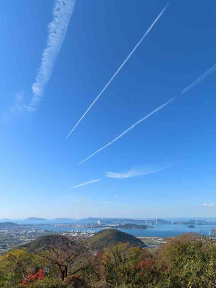 白峯寺の展望台からは瀬戸内海の島々と瀬戸大橋が一望でき、澄み渡った空には飛行機雲が綺麗な直線を描いていました。