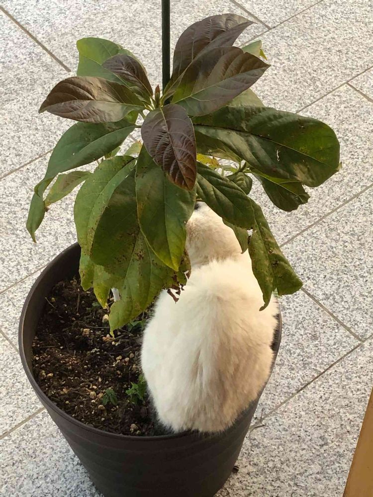 アボカドさん、初霜柱を観測したので、家の中に入れようと思ったら、ノラ猫さんが根元で温めてくれてました。