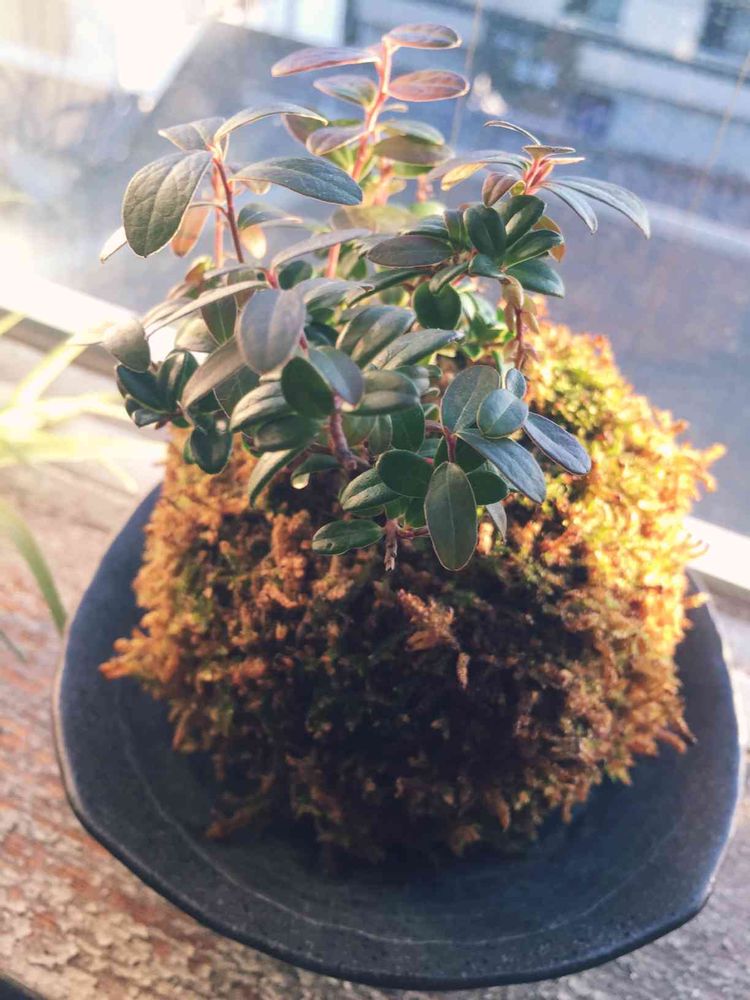 全然緑じゃないけど、夕日にあたる苔玉は綺麗です
