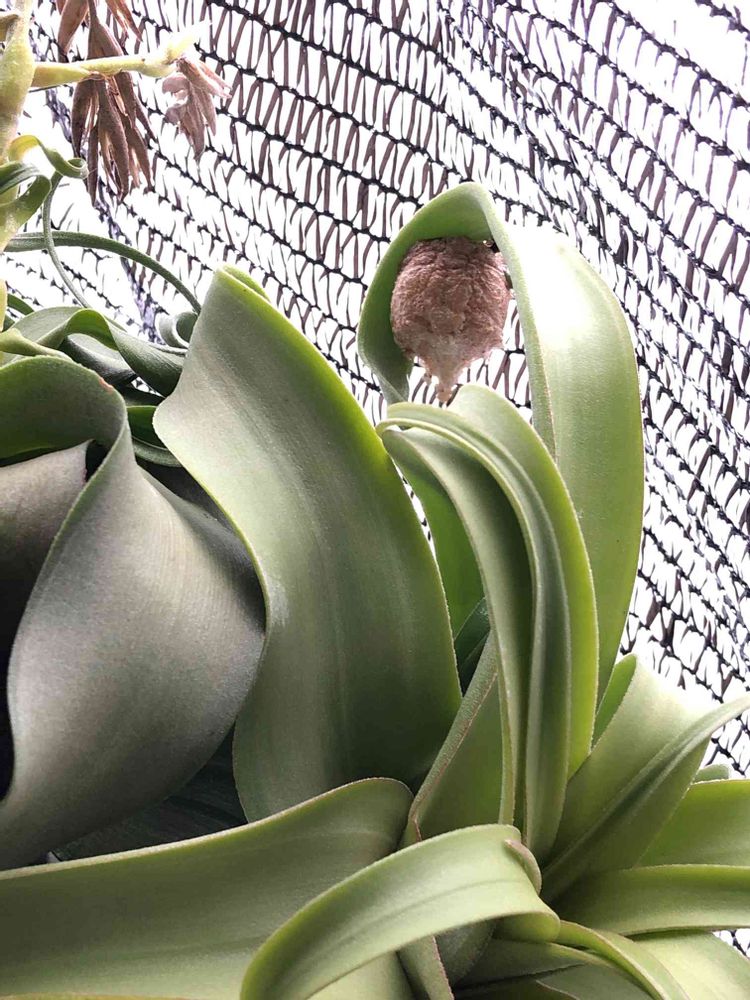 お水をあげようと取ろうとしたらくっついてた😅カマキリの姿はどこにもないのに👀かなりの放置で葉っぱがクルクル😅