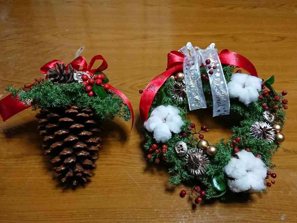 買い物も止めて、朝からクリスマスリースをワンコと戦いながら2つ作りました。