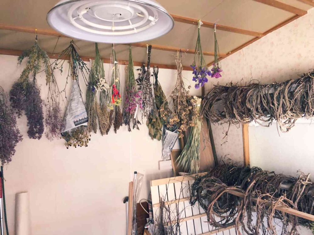 これはまだ少ない時期ですが、どんどん出来上がると天井いっぱいがドライフラワーになります。