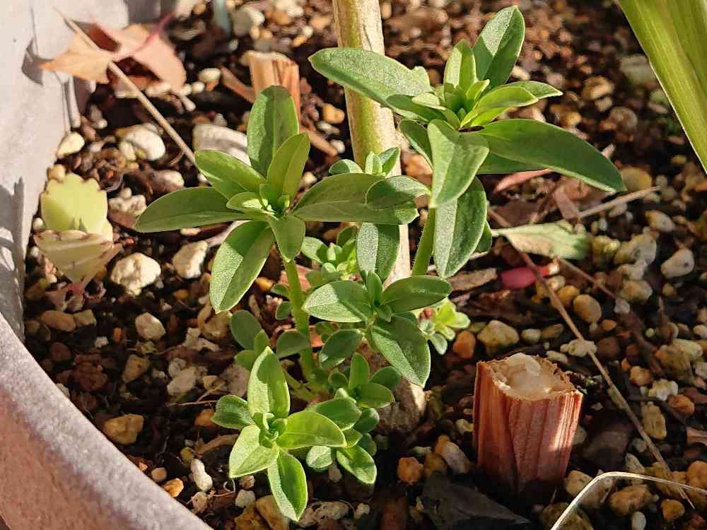 球根を肥らすために残しておいた隣のグラジオラスの葉っぱは キンギョソウ新芽の