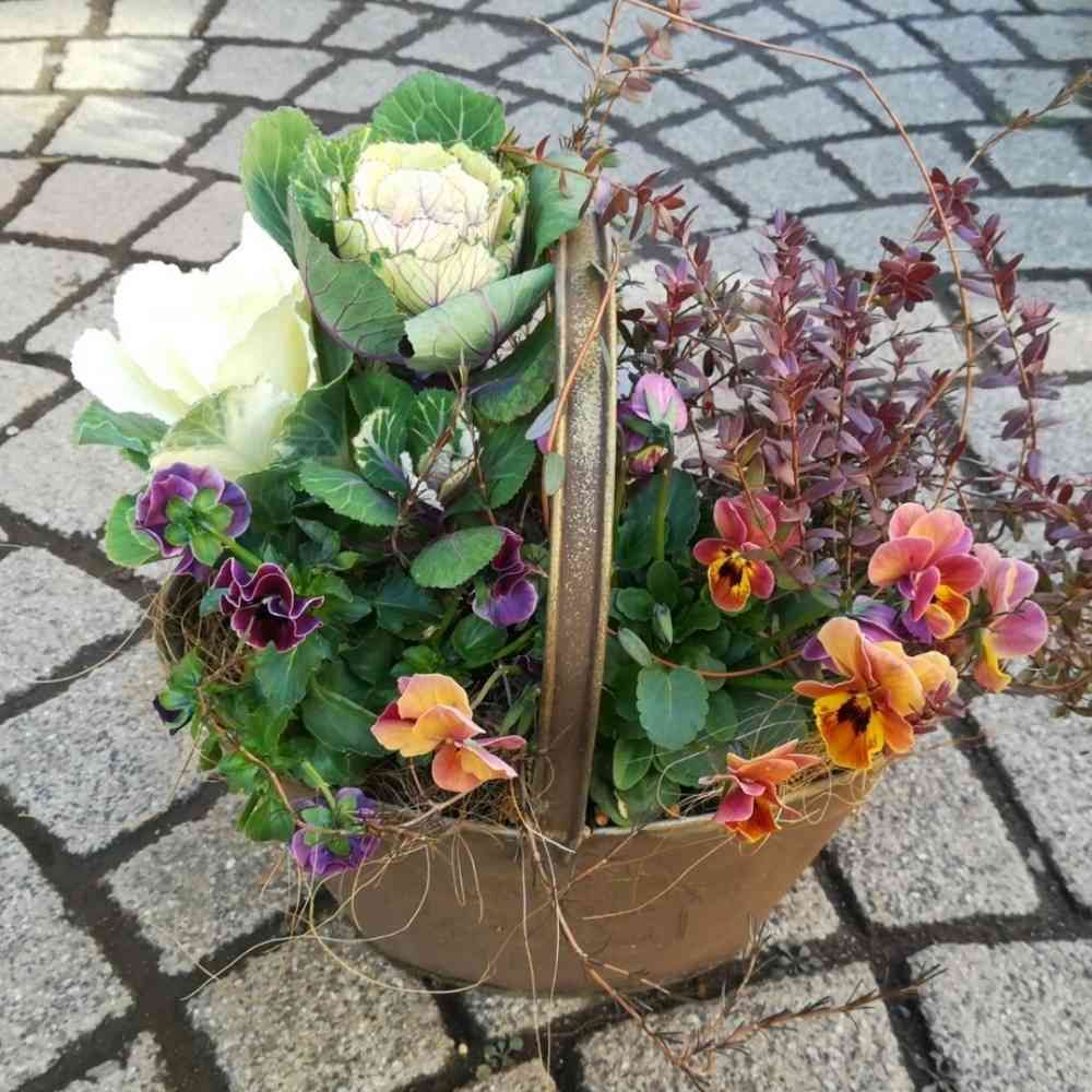 ブロンズカラーのブリキとビオラなどで寄せ植えをつくりました。