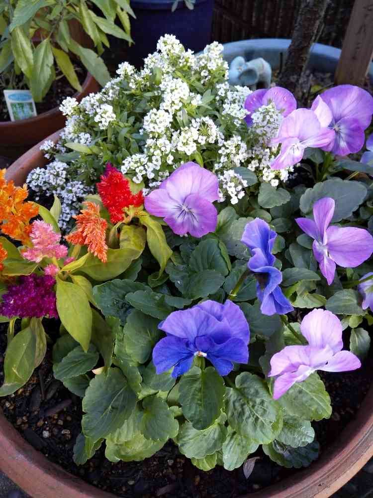 今日は陽が差し気持良いので庭へ。寄植え少しこんもりとなりました。パンジー達かわいいですね😉