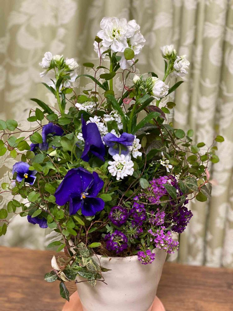 4号鉢にストック、イベリス、よく咲くスミレ、スィートアリッサム、初雪カズラ、ワイヤープランツ入れました💗
