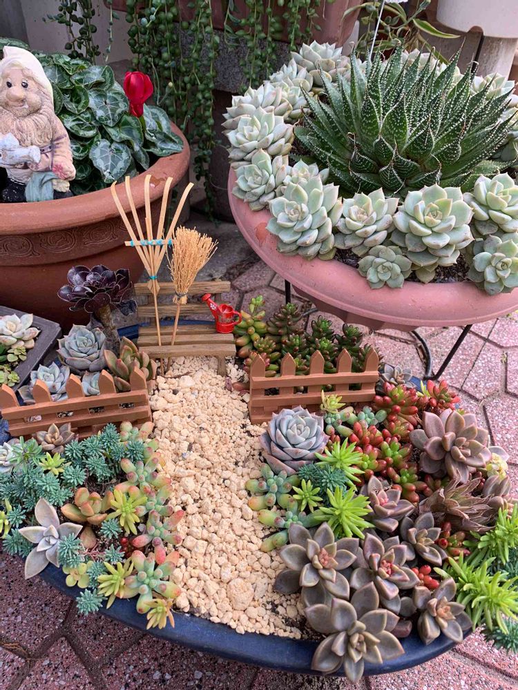 寄せ植えに使ってるミニチュアのガンジキと竹ぼうきは私が31年前の結婚の結納で使った高砂人形の手に持ってたものです😅