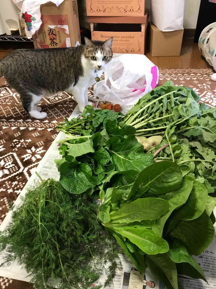 ねこさんの狙いは、やはり かつお菜でしょうか? 遂にねこ界にも・・