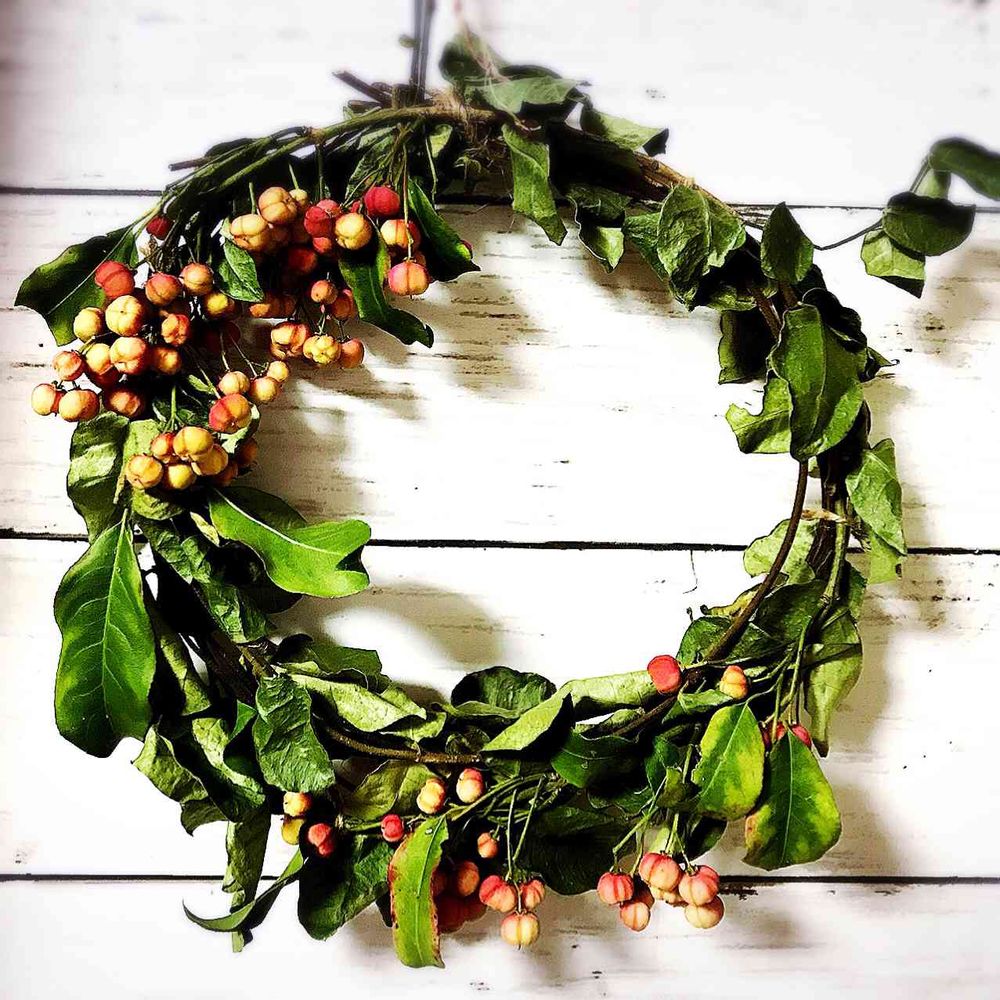 マユミの実が付いた枝を、クルッと円にして作った簡単リース😁✨
