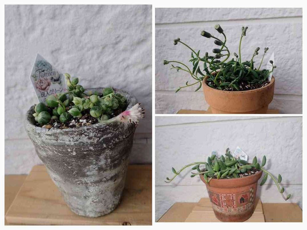 前出の多肉さんたちと一緒に買ったネックレス6種セットのうち3種です(*^^*)斑入りグリーンネックレスは、持っているのですが、いつの間にか斑が消えて立たせのグリーンネックレスになってしまっていたので、再度手に入ってうれしいです。ちょっと小さい株ですが花も付いていて、かわいい💕ドルフィンネックレスはイルカのようなかたちのはっぱが可愛らしくて気に入りました♪アーモンドネックレスは前出の多肉セットの中にも入っていたので2株植えです。ダブりはセットものならあることなので仕方ないと思ってます。ショップによっては配慮してくれるところもあるんですけどね~ここは激安がウリなので文句はないです♪お値段以上のいい苗でしたし😁