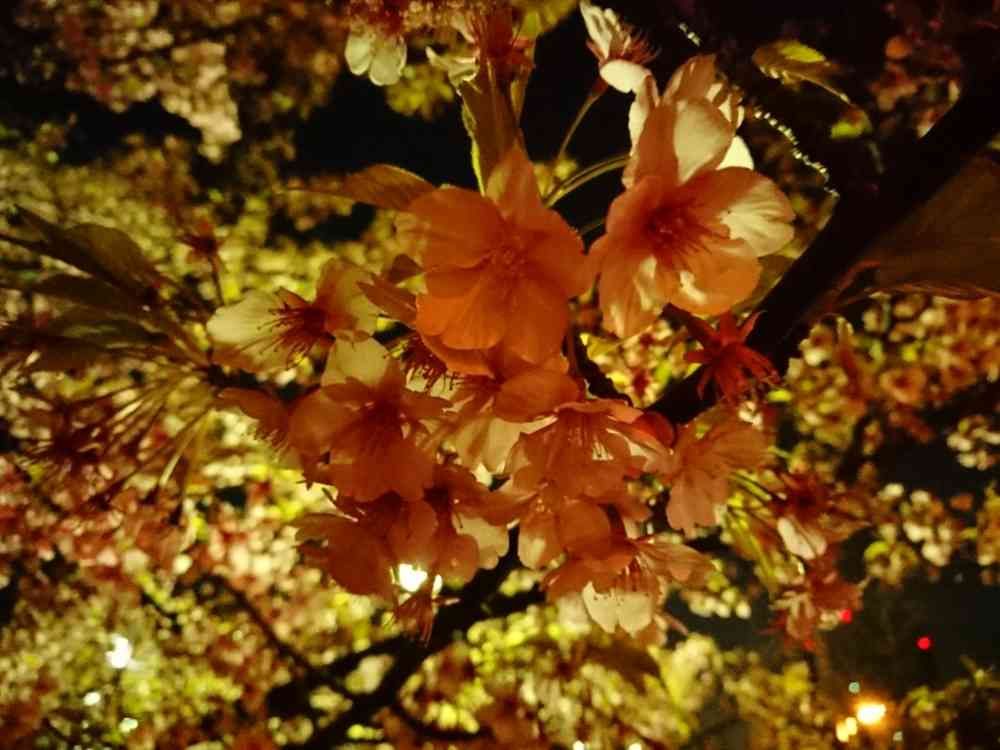 夜の散歩で見つけた川津桜。写真の色がかなり変ですが、それはそれでキレイかなと。