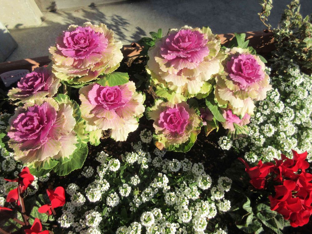 綺麗な葉ボタンが見られる季節になりました。大きな鉢にびっしり植えられて見ごたえありです。