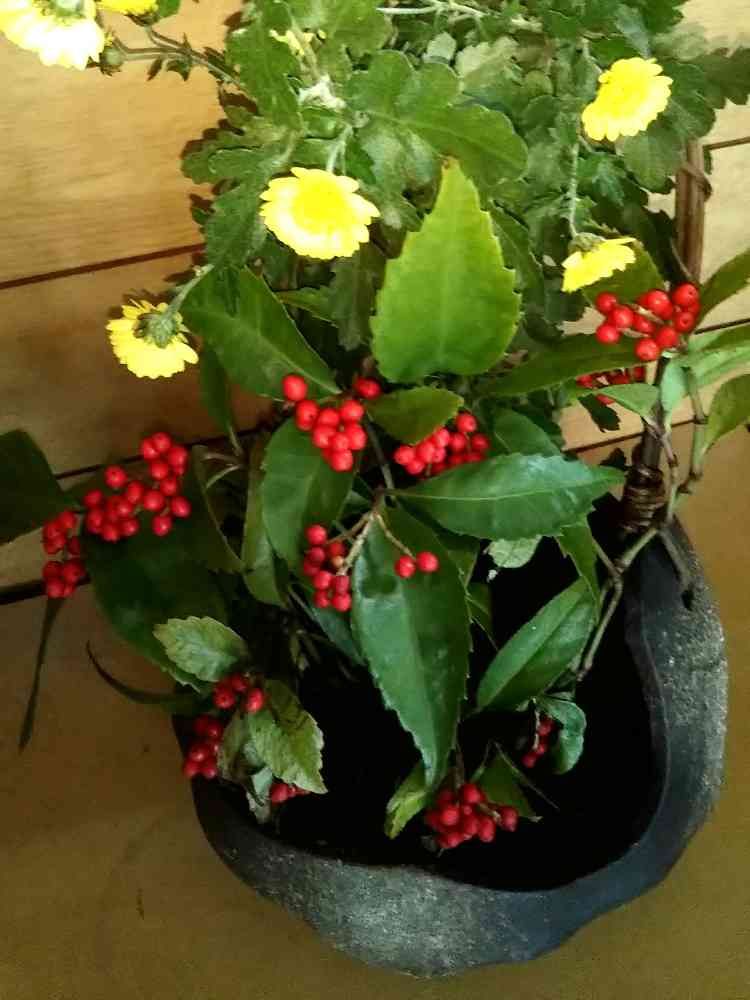 庭の🌿千両🍒🌿&💛黄色い🏵️菊💛を活けてみましたぁ❗️❗️