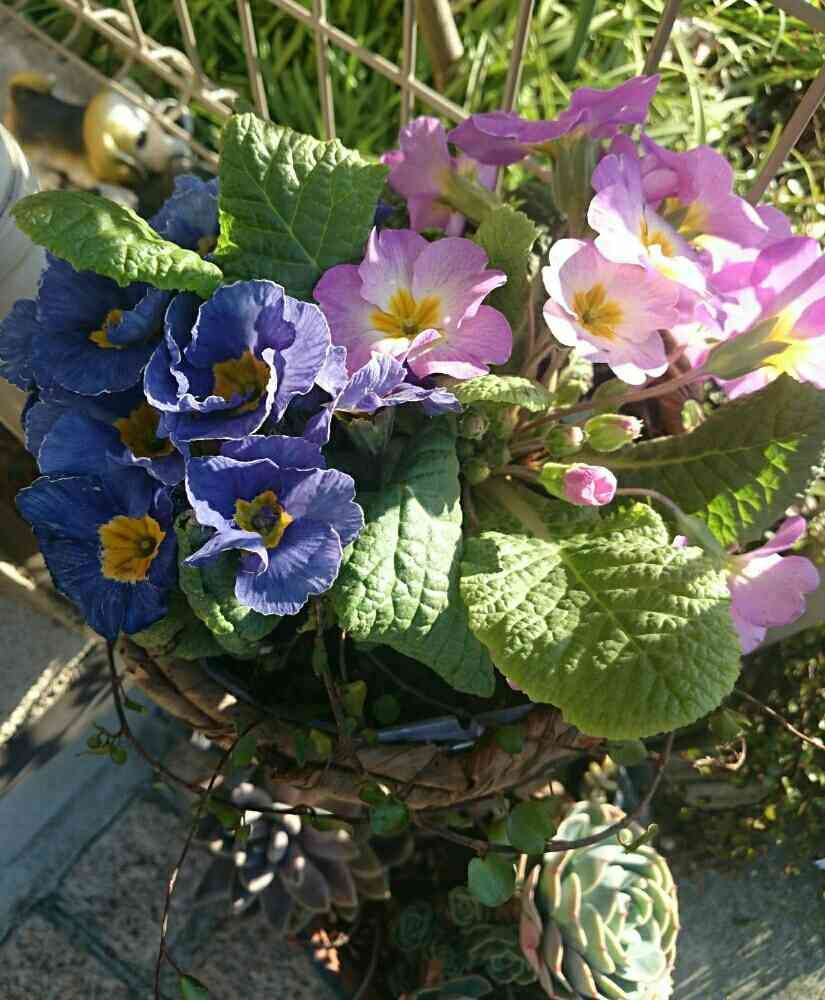 💠プリムラジュリアン💠たくさんある色の中から、姉にも色違いを選んで寄せ植えました。