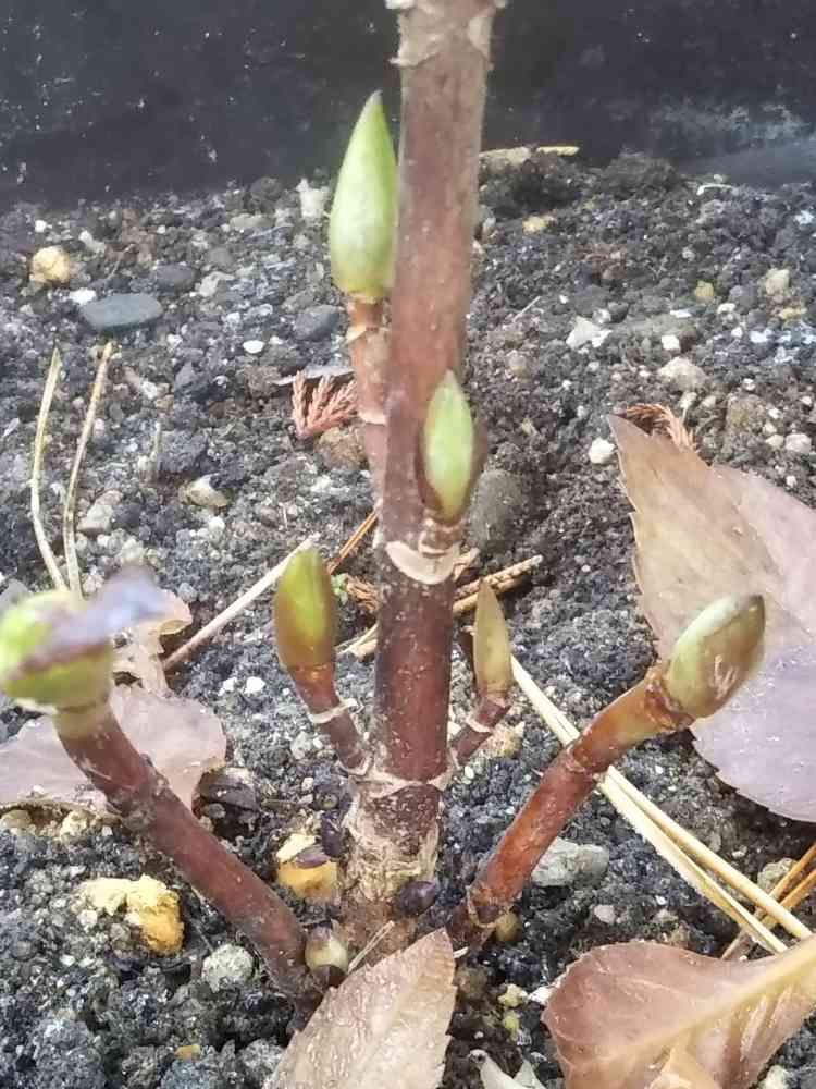 雪囲いの下のアジサイの鉢から🌱を発見👀
