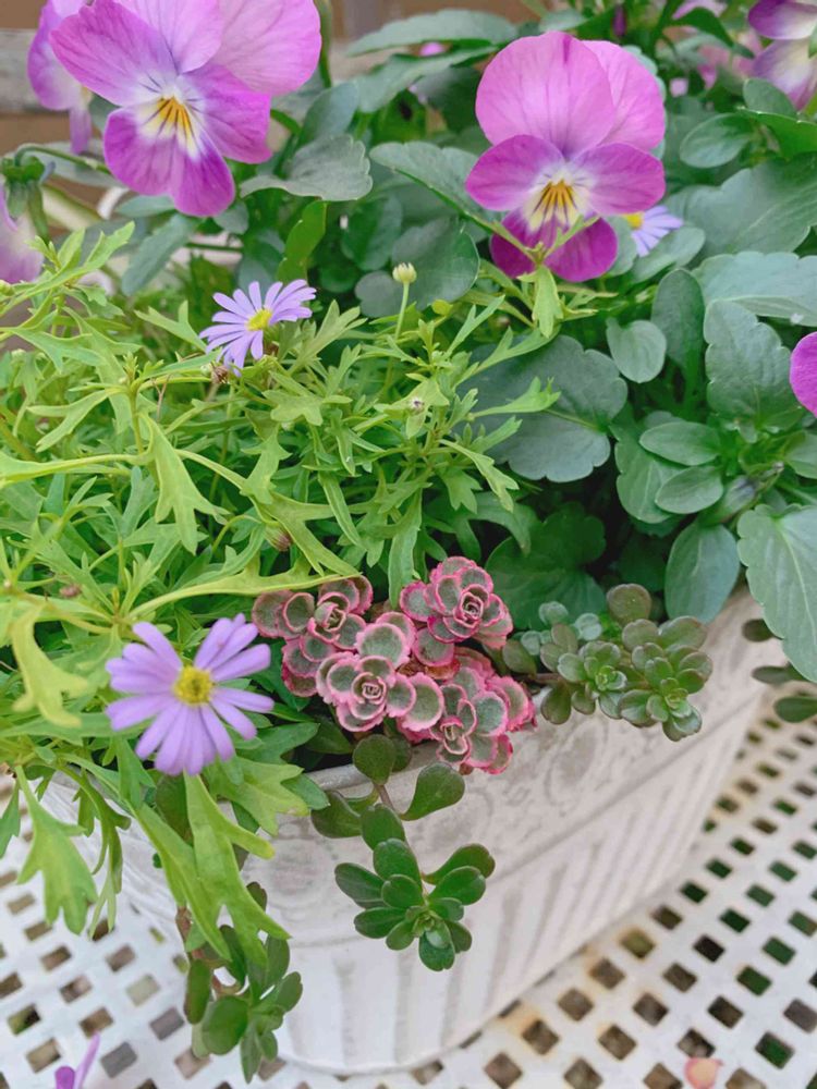 水の大好きなビオラ(かな?)などとセダムの寄せ植え🤩❣️