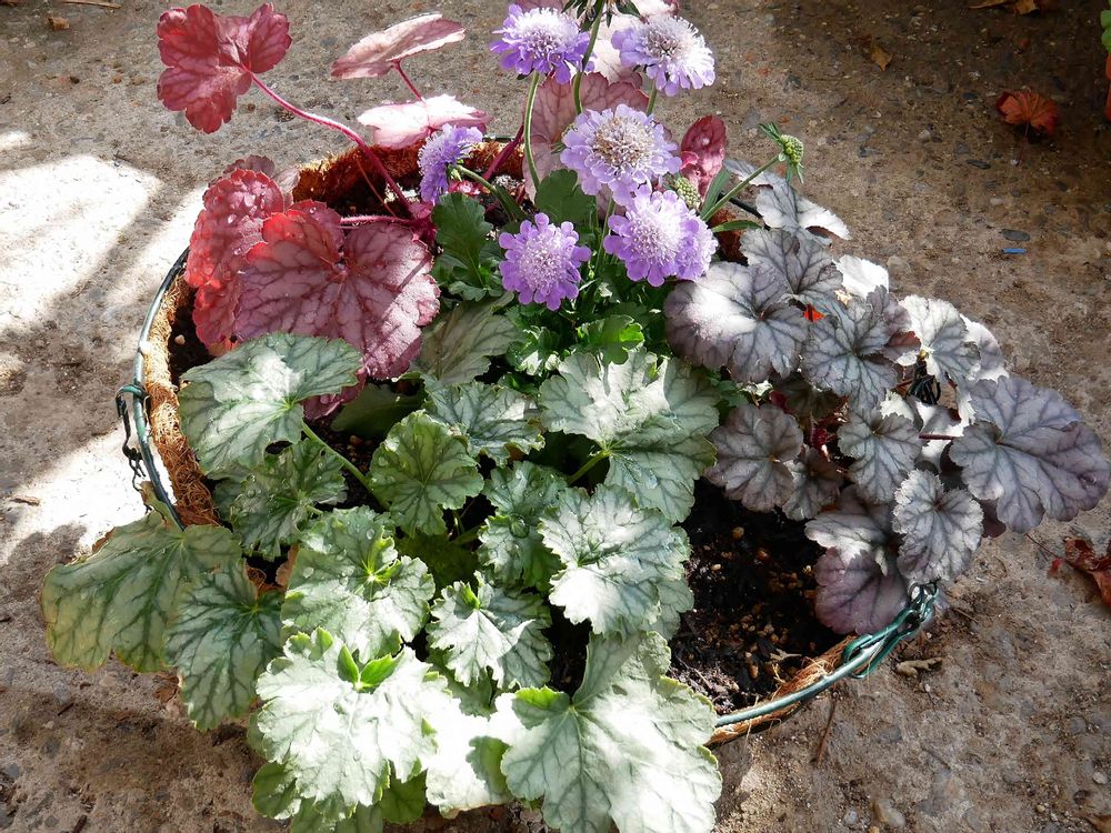 ヒューケラに手を出しました。スカビオサさんとハンギングバスケットに寄せ植えしてみたの。 さて、どこに吊そうかな( ̄∀ ̄*)イヒッ