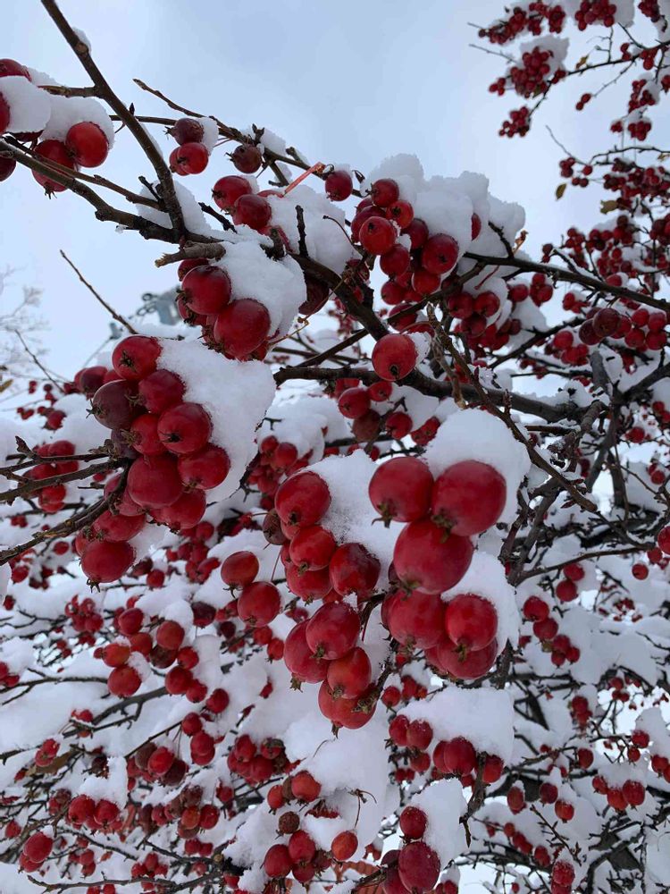 こんなに雪が降ってる、そして可愛いリンゴ!姫リンゴというのですね🍎🍎🍎リンゴが気になっているのを見るのは2度目かな🍎😊