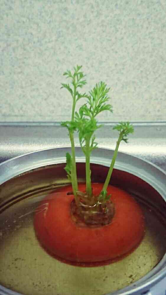 ニンジンの切れ端から出る芽。 可愛いサイズの切れ端が出ると、ついつい育ててしまう。