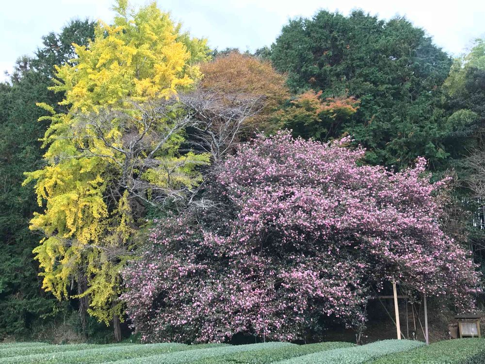 そうなんです。手前は素晴らしい茶畑です。サザンカは市指定天然記念物で