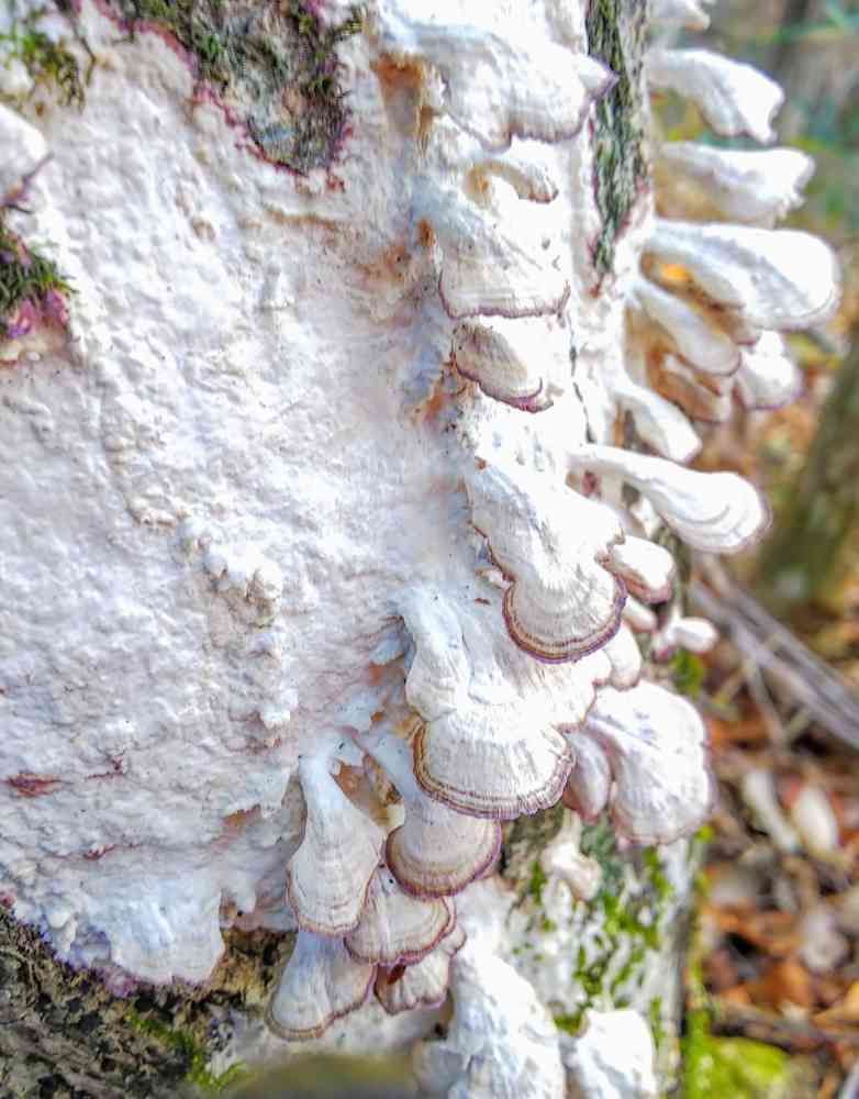 茸の菌床が、倒木から、生きている樹木の表皮へと領域を拡大している状況です。