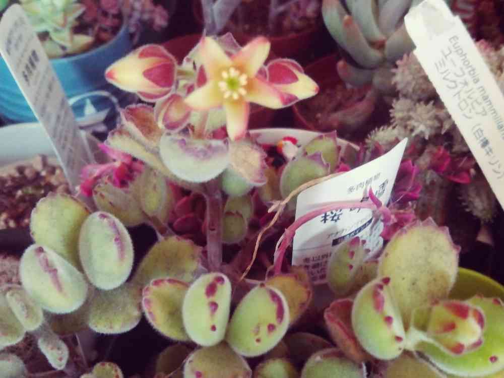 雑多で見にくいかもしれませんが、10月くらいからずっと蕾だった熊童子ちゃんが開花しました!