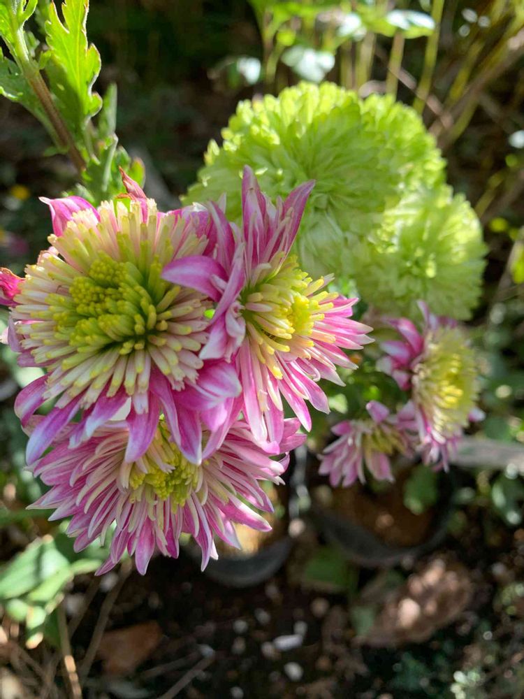 GSのひろさんの投稿でキレイだなぁ✨✨と一目惚れしたピンクと緑の菊を、グリーンセンターで見つけグリーンの丸い菊と一緒に庭植えしました💕