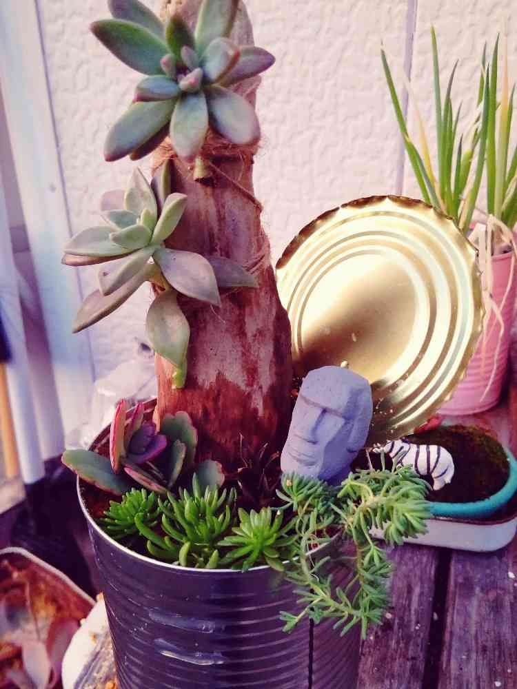 ずっと欲しかったモアイ🗿さん。中サイズの缶ももらったので箱庭に。流木には秀麗さんと朧月さん?をくくりつけちゃいました。