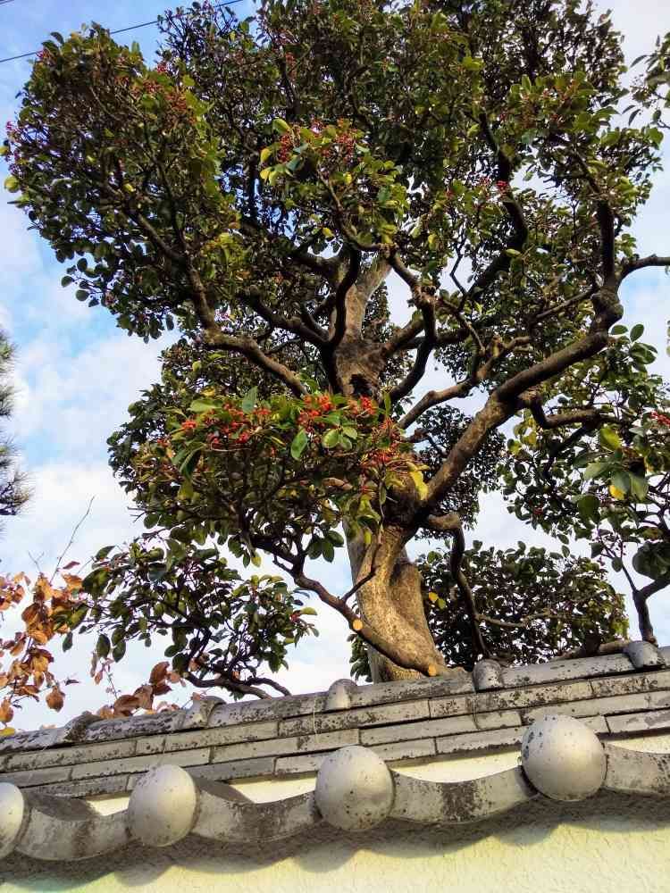 あの武家屋敷風の邸宅の白壁の向こうから赤い実のなったきれいな木