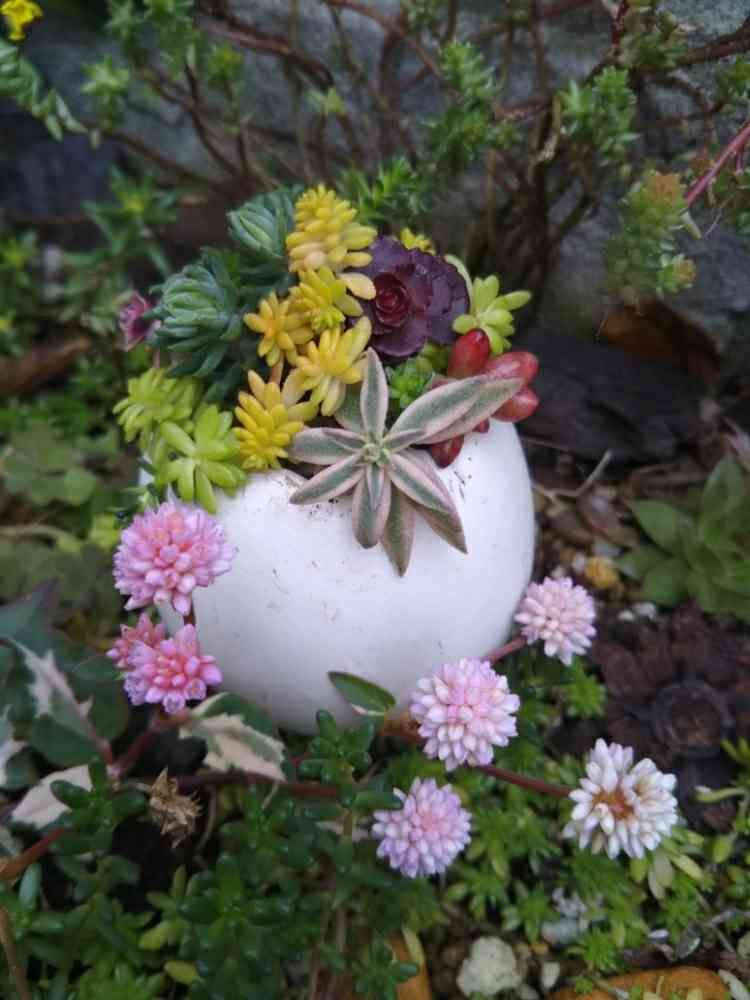 この玉子型の陶器の器にセダムガーデンで摘んだ子達をギュッと詰め込んだら、10種類くらいになりましたよぅ🎵