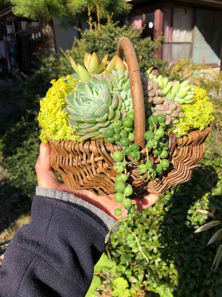 陶器でなく籠に寄せ植えするのも素敵ですね!