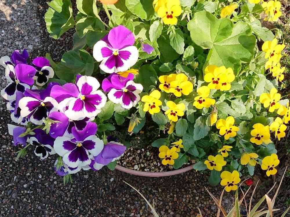💐寄せ植えにしたビオラ同じケースのを買ったのにパンジーに化けてしまったよ。