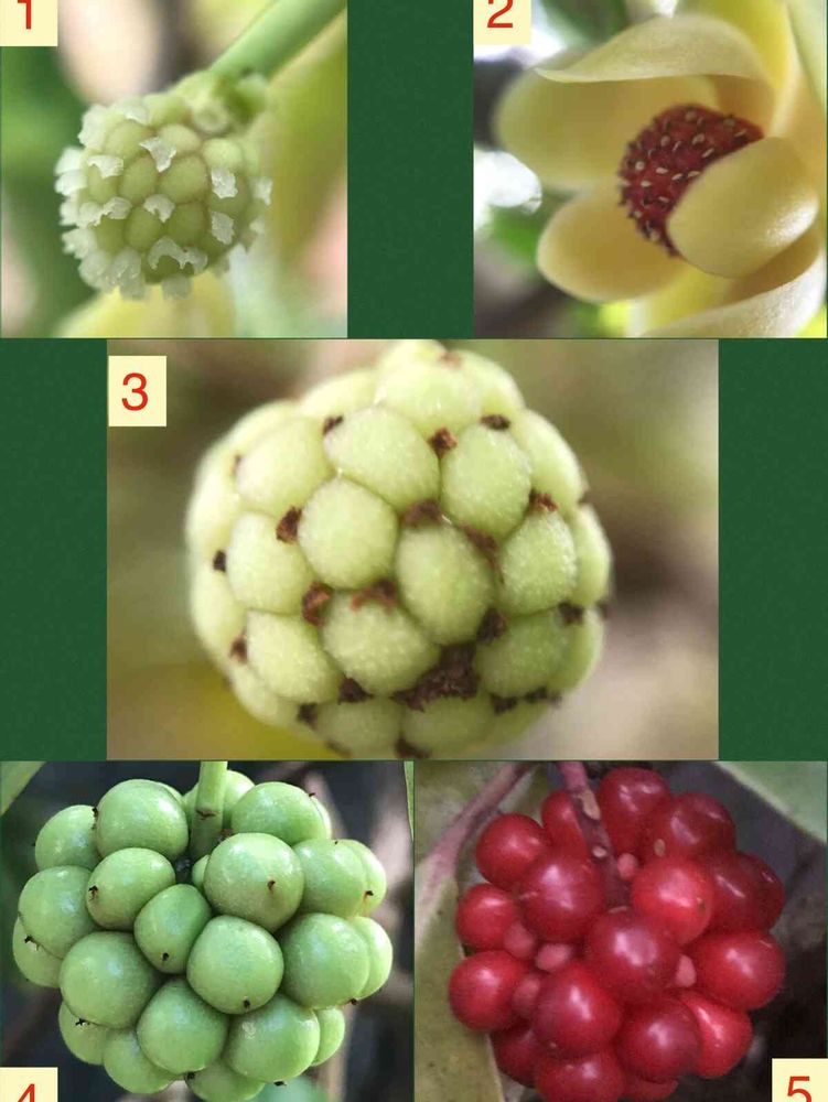 1、雌花 (受粉後) 2、雄花 3〜5、果実の変化。3番はサッカーボール⚽️みたいですね😊