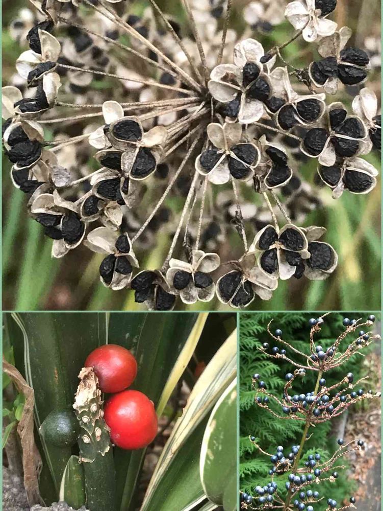 ニラ、ヤブミョウガ、オモト(上から時計回りに)。