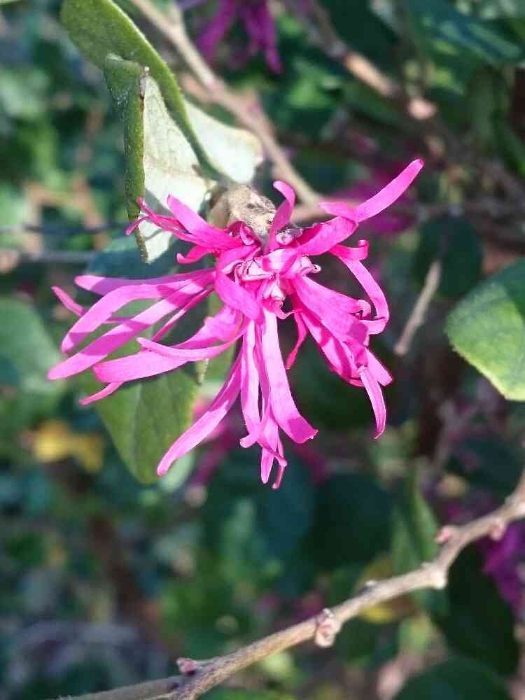 この時期は、どちらかと言えば狂い咲きになりますでしょうか。春先は、樹全体が恋ピンクになるくらいたくさん花がつきますよ。黄色の普通のマンサクより、ちょっと派手めです(^_^)