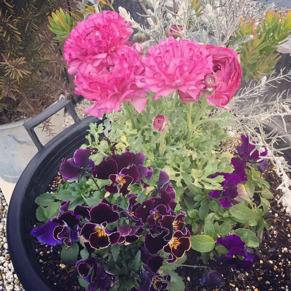 パンジー、ビオラ、ラナンキュラス、その他シルバーリーフの適当寄せ植え( ´ ▽ ` )最近暖かくなって来て一気に開花✨