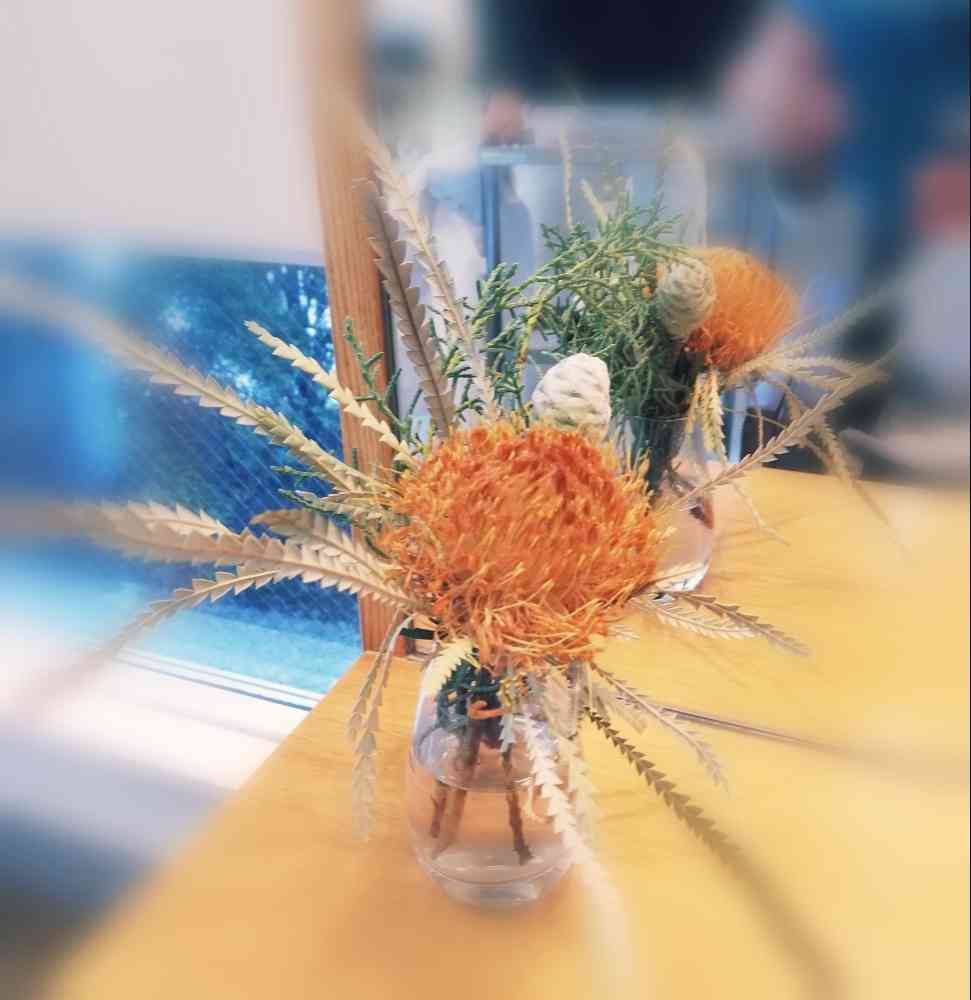 美容室の鏡の前に飾っていました❗ 花の名前はわかりませんが、ドライフラワーのような…感じでしたが、ちゃんと 水に浸かっていました🎵