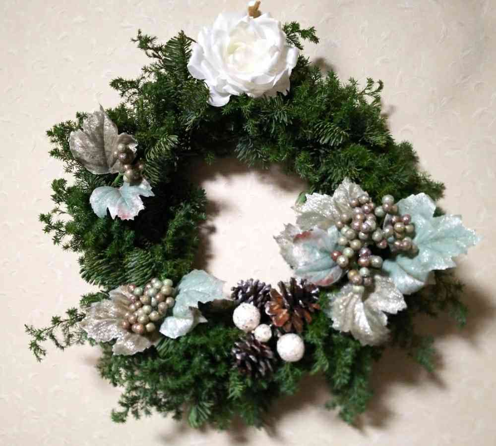 ヒムロ杉ともみの木のリースに、松ぼっくりとアーティフィシャルフラワーのノブドウとバラをあしらいました😃✨